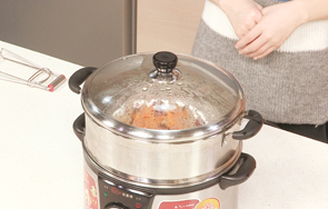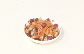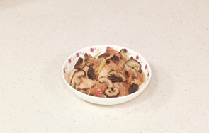 取一蒸盘,倒入腌渍好的食材,放入香菇片。
