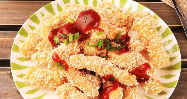 倒入鸡肉条,搅拌匀炸至金黄色。