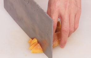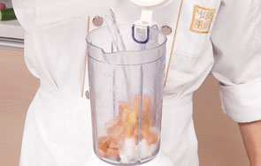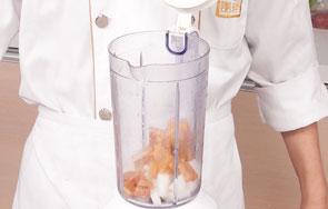 取榨汁机,选择搅拌刀座组合,将切好的水果倒入杯中。