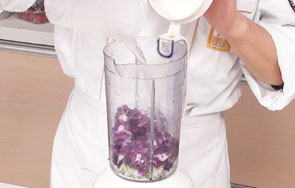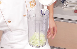 取榨汁机,选择搅拌刀座组合,将切好的包菜放入搅拌杯中。