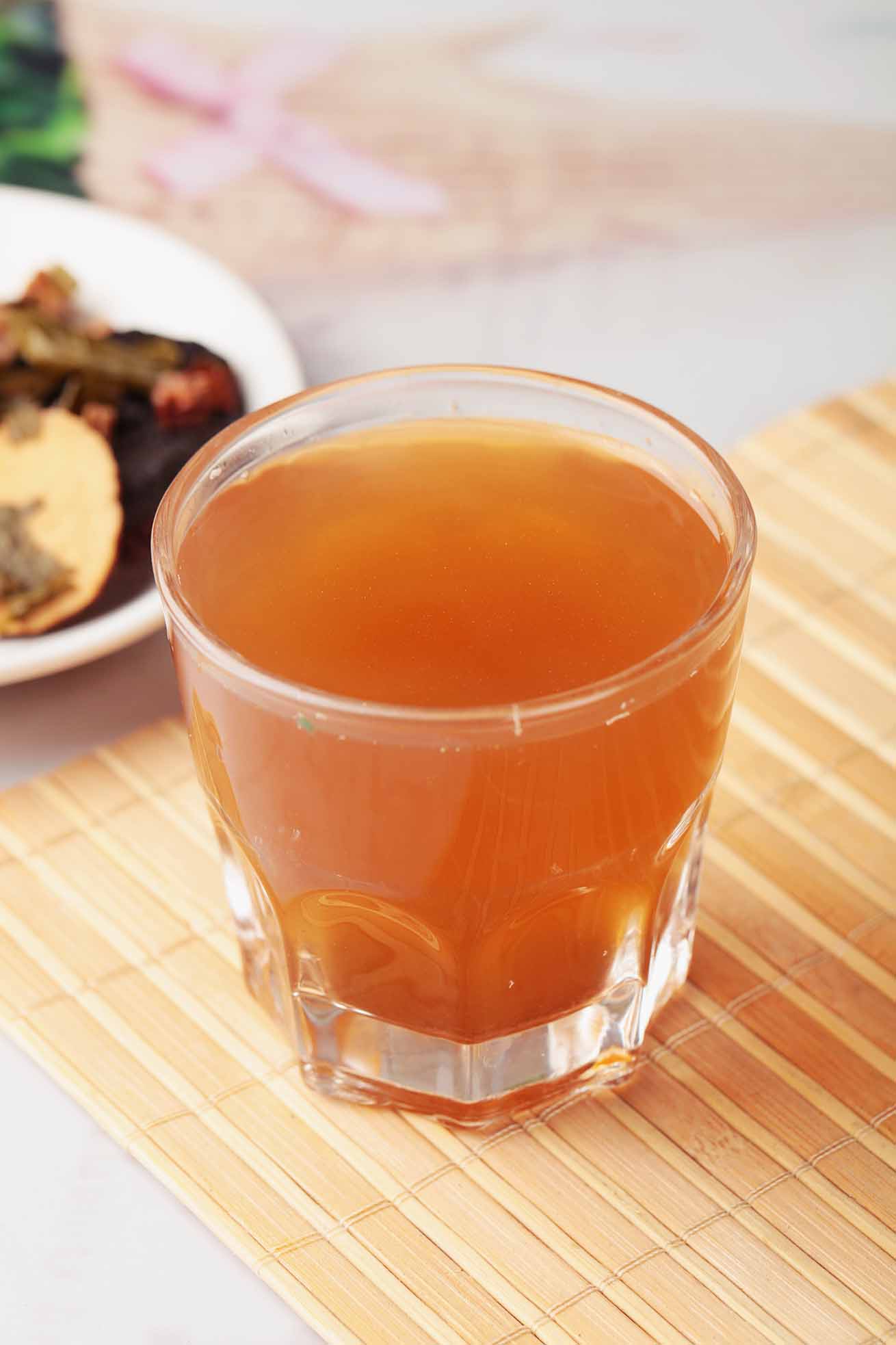 滤取茶汁,装入杯中,趁热饮用即可。