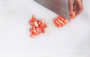 洗净的西红柿对半切开,切小瓣,改切成丁。