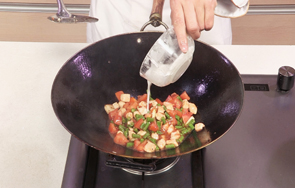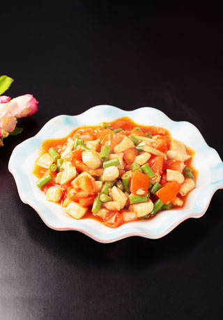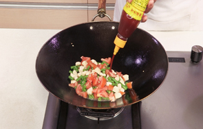 加入适量番茄酱、白糖、盐,炒匀调味。