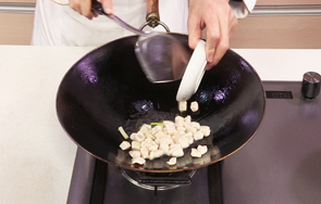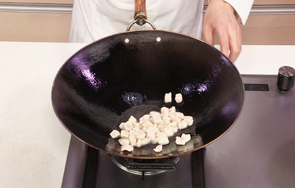 用油起锅,倒入鸡肉丁,炒至变色。