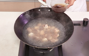倒入鸭块,淋入适量料酒。