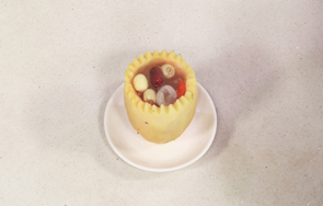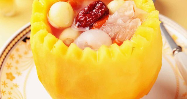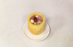 利用木瓜天然的外形制成的汤盅里,盛放着桂圆红枣这养颜美容的好搭档,到最后还可以将汤盅一起吃掉哦。