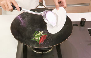 用油起锅,倒入葱段、蒜末和红椒丝爆香。