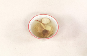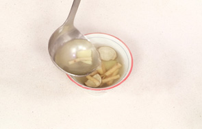 揭盖,关火后盛出煮好的汤汁,装入碗中。