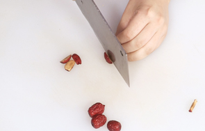 将洗净的红枣切开,去核,切成小块,备用。