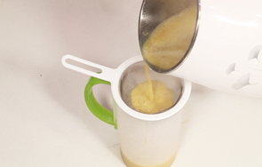 把煮好的豆浆倒入滤网,滤取豆浆。